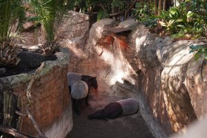 En este viaje por el continente asiático encontraremos rastros de la actividad humana. Un precioso templo nos cautivará más todavía al descubrir al habitante que se mueve en la densa vegetación de Camboya: el tigre de Sumatra. Muy cerca de estos felinos nos encontramos con un bosque ribereño, una zona que resulta ser una unión perfecta entre diferentes hábitats. Muy cerca del río, descubriremos al tan amenazado tapir malayo, que a su vez comparte recinto con el curioso binturong, que suele permanecer en ramas medias. Al otro lado, en el lecho del río, podremos conocer las curiosidades de los tomistoma, una especie que se encuentra dentro de un programa de cría en cautividad. En las ramas más altas de la isla central veremos al gibón de mejillas doradas, un curioso primate de largos brazos que destaca por su habilidad acrobática y sus fuertes aullidos. Terminaremos nuestro viaje entre las ruinas de templos abandonados, donde destaca un minarete elevado en el que un grupo de orangutanes juega, descansa y muestra su comportamiento natura