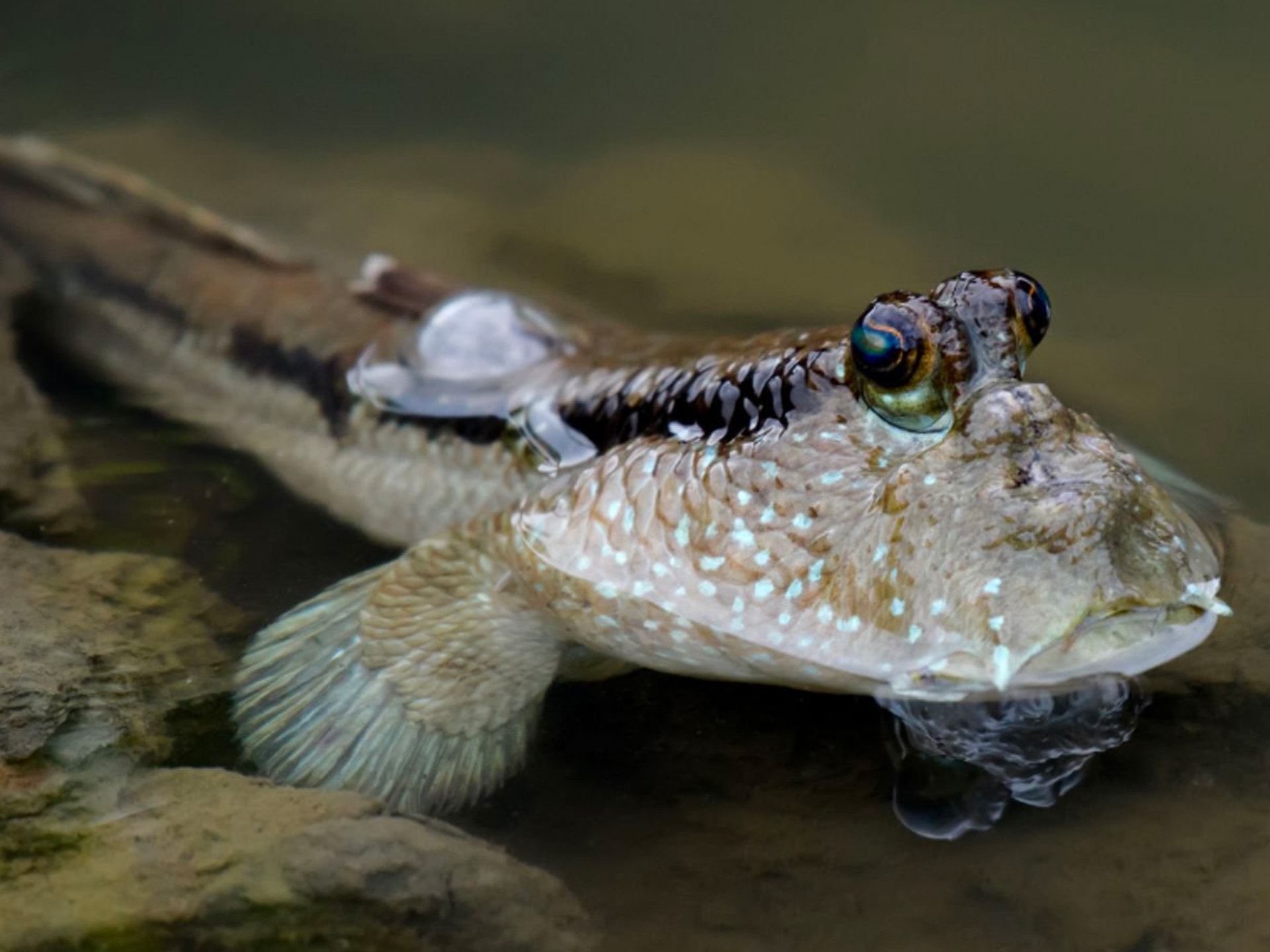De color marrón o grisáceo y aspecto resbaladizo, tiene pequeños puntos de color dorado o azulón a lo largo de su cuerpo. La cabeza es muy grande en comparación con el cuerpo. El labio superior está cubierto por un pliegue de piel. Como carecen de párpados, los ojos son saltones y retráctiles, de modo que los retrae frecuentemente en unas cavidades especiales, que le permiten limpiarlos y humidificar el globo ocular. Posee dos aletas dorsales flexibles provistas de espinas que elevan al sentirse amenazados. Estas son finas y alargadas, actuando como pequeños brazos a la hora de desplazarse por el lodo. Para desplazarse rápidamente, dan grandes saltos usando la cola como resorte. Carecen de pulmones, pero poseen unas cámaras herméticas especiales en las branquias que les permiten almacenar agua y son utilizadas como reservas de oxígeno; de este modo, pueden desplazarse por tierra e incluso trepar a los árboles.