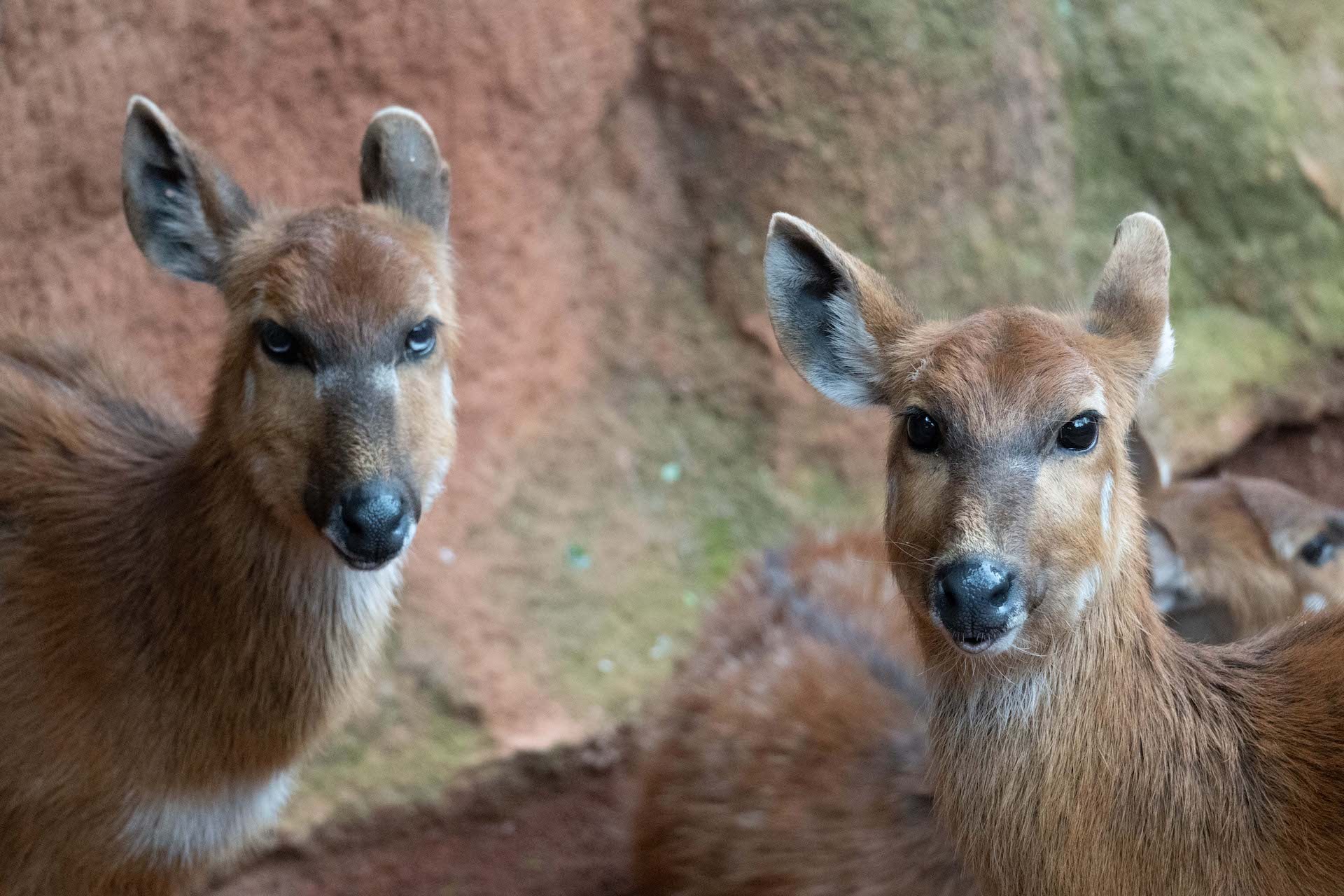 Es frecuente encontrar individuos solitarios o bien formando pequeños grupos de unos 6 miembros, con un macho adulto, algunas hembras y sus crías. La hembra suele llevar a sus crías a zonas densas de vegetación para protegerla de posibles depredadores mientras las está amamantando.