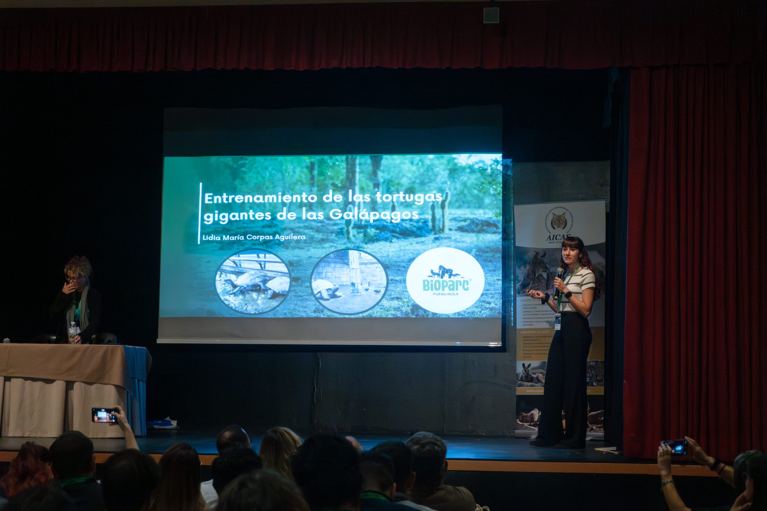 Lidia María Corpas, cuidadora de reptiles de Bioparc Fuengirola, quien mostró el sorprendente proceso de entrenamiento cooperativo con tortugas gigantes de las Galápagos. Mediante el uso de colores y refuerzo positivo, las tortugas aprenden a participar voluntariamente en revisiones y curas sin necesidad de inmovilización, una técnica pionera aplicada a reptiles y que representa un salto cualitativo en su bienestar.