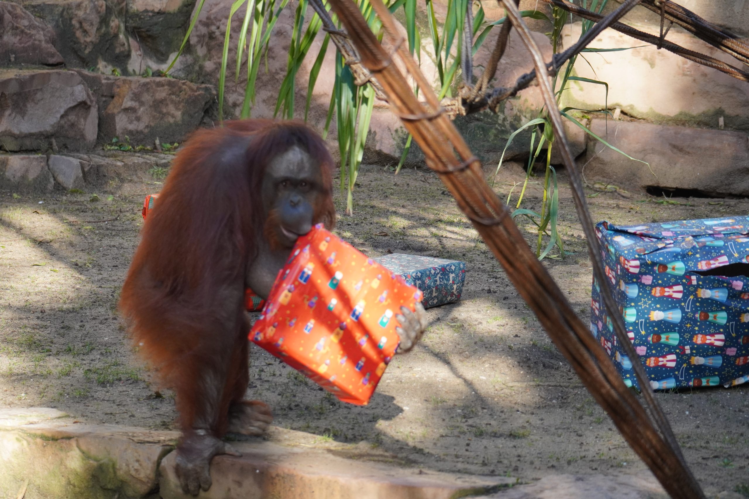 La inesperada visita ha generado un momento tan entrañable como educativo, en el que los grandes primates han recibido varios regalos cuidadosamente preparados por el equipo de cuidadores. Envuelto en papel y cajas, el contenido escondía una selección de frutas y verduras frescas, adaptadas a su dieta, que despertaron inmediatamente la curiosidad de los orangutanes.