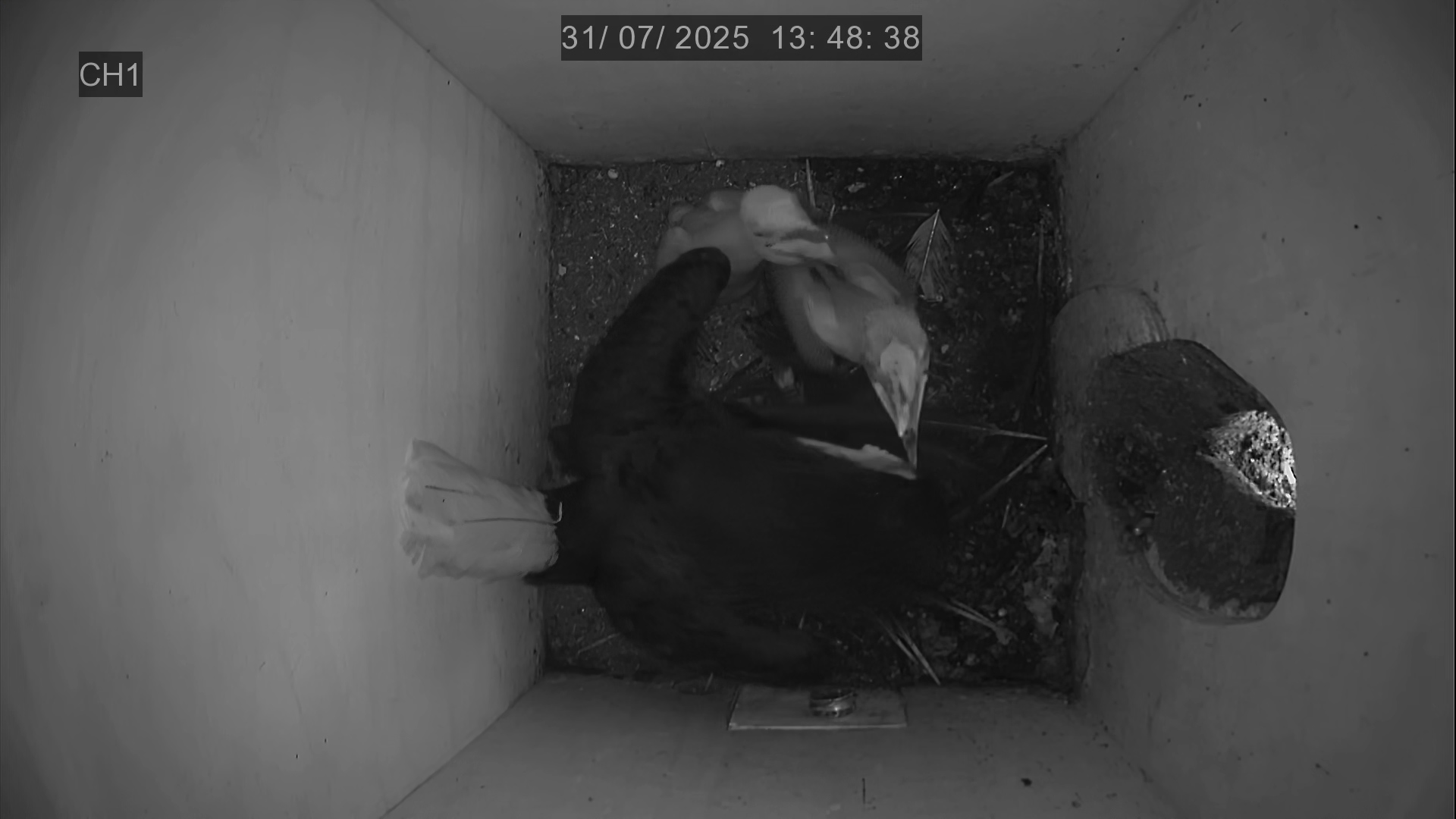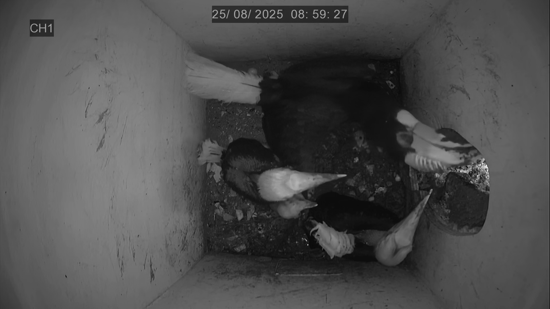 Tras la delicada incubación y el esfuerzo conjunto de ambos progenitores, los polluelos rompieron el cascarón y permanecieron resguardados en el nido, dependiendo completamente de los cuidados de sus padres hasta alcanzar el desarrollo suficiente para salir al exterior. En el caso de la madre, esta ha llegado a pasar entre cerca de cinco meses en el interior del nido, siendo dependiente del soporte del macho.